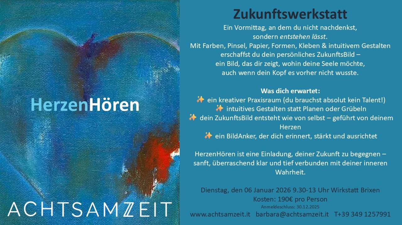 Start: 10. September – 10. Dezember Treffen: 1x pro Woche online oder in Brixen (mit Aufzeichnung). Begleitung und Austausch über eine Facebook Gruppe